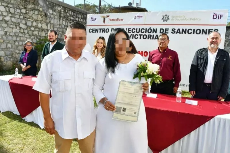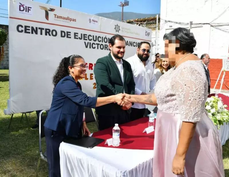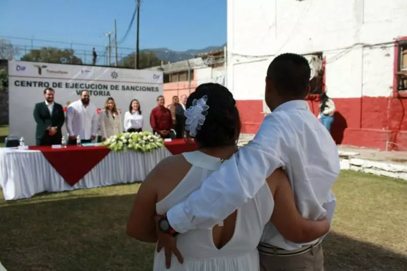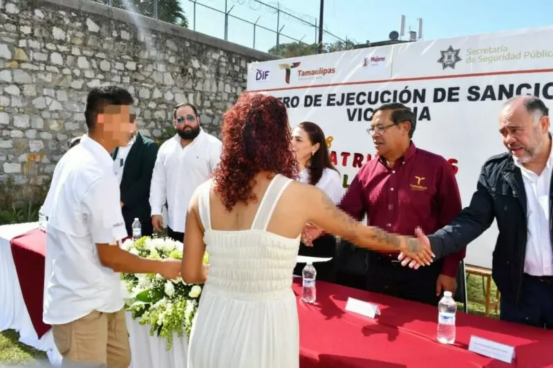 La ceremonia de matrimonios colectivos fue posible gracias a la sinergia entre la Secretaría de Seguridad Pública de Tamaulipas (SSPT), el Sistema DIF Victoria, la Dirección de Oficialías del Registro Civil y el Instituto de las Mujeres en Tamaulipas, y consistió en el enlace legal de 11 parejas integradas por PPLs y 10 entre residentes del CEDES Victoria y personas externas.